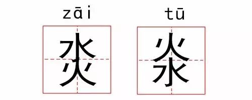 zāi字通灾,大概是水火成灾的意思?可是这上下颠倒又是什么鬼……tū在字书上也就只标了一个音,字义都没有一个,猜不透古人的脑回路。