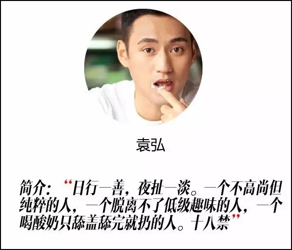 袁弘曾是一个被说段子耽误了演艺事业的男演员,会说段子能卖萌,经常开车,偶尔写诗。最近袁弘通告接的多了,段子手生涯已经停滞,但是微博简介里依然保持着一个段子手老司机的精(zhong)神(er)面貌。